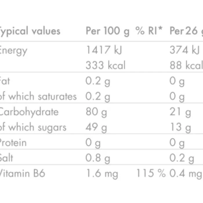 Ravintoarvot per 100 g: Energia: 1417 kJ (333 kcal), rasva: 0.2 g (josta tyydyttyneitä rasvahappoja: 0.2 g), hiilihydraatit: 80 g (josta sokereita: 49 g), proteiini: 0 g, suola: 0.8 g, vitamiini B6: 1.5 mg.