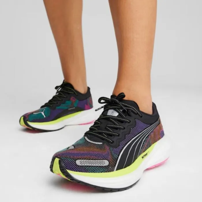 Puma Deviate Nitro 2 on erittäin monipuolinen ja nopea harjoituskenkä Pumalta. Siinä on Puman joustava Nitro Elite -vaahto välipohjassa, joka tarjoaa pehmeän ja kimmoisan juoksu kokemuksen, yhdessä tavallisen Nitro-vaahtomaisen kanssa, tekee siitä kestävän ja hauskan kengän. Lisäksi välipohjassa on hiilikuitulevy, joka antaa vielä enemmän joustavuutta samalla kun se antaa kengälle vakautta. Ulkopohja on päällystetty Puma Grip -materiaalilla, joka tarjoaa erinomaisen pidon ja kestävyyden. Päällinen on valmistettu verkosta, joka antaa hengittävyyttä, lisäksi siinä on PWRTAPE, joka varmistaa, että jalkasi pysyy paikallaan ja antaa vakautta.