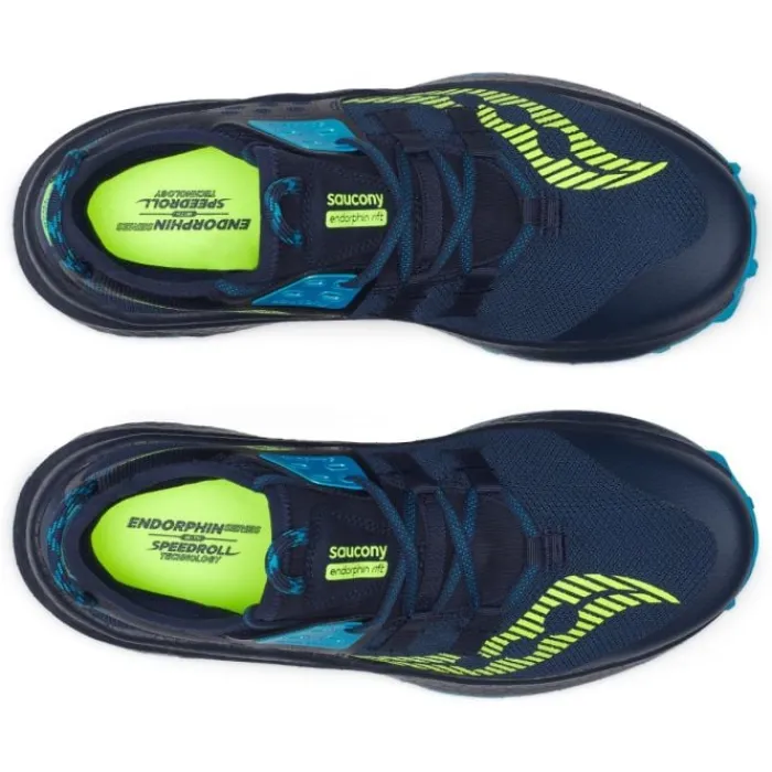 Saucony Endorphin Rift on äärimmäisen monipuolinen polkujuoksukenkä. Endorphin Rift on valmistettu Sauconyn huippulaadukkaasta PWRUN PB -vaahtomateriaalista, joka on erittäin pehmeä ja energiaa palauttava. Kenkässä on SpeedRoll-tekniikka, kuten kaikissa muissa Endorphin-sarjan kengissä. Se on neutraali juoksukenkä ilman sisäänrakennettua levyä, mikä tarkoittaa, että se on hieman joustavampi ja liikkuvampi. Endorphin Rift on kuitenkin varustettu suojaavalla kivilevyllä välipohjassa kestämään haastavaa maastoa. Endorphin Riftin päällinen on sukkamainen muotoilu. Kengässä on 6 mm kantakorkeus ja karkeat ja syvät nappulat pohjassa.