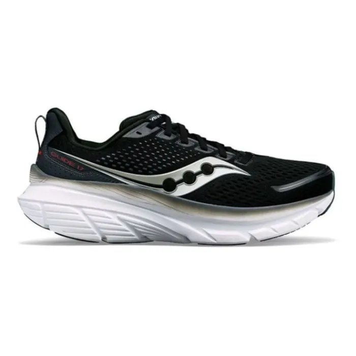 Saucony Guide 17 on kevyt juoksukengä, jossa on vakausominaisuuksia ja innovatiivisia toimintoja. Nämä parannukset tekevät kengästä joustavan, mukavan, tasapainoisen ja vakaan, mikä tekee siitä ihanteellisen juoksukengän. Tämä versio esittelee uudenlaisen lähestymistavan vakaudelle käyttämällä Center Path -teknologiaa ja tarjoaa leveämmän pohjan, joka korostaa vakautta sekä mukavuutta ja turvallisuutta. Kengässä on ainutlaatuinen epäsymmetrinen pohjallinen, joka ohjaa jalkaa jokaisessa askeleessa ja vähentää pronointia. 6 mm:n kantapäästä varpaisiin -droppi parantaa vakautta tilavamman välipohjan ansiosta. Kestävän ja reaktionomaisen PWRRUN-välipohjan yhdistelmä pehmeän PWRRUN+ -sisäpohjan kanssa takaa poikkeuksellisen iskunvaimennuksen ja mukavuuden.