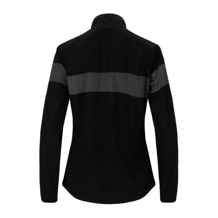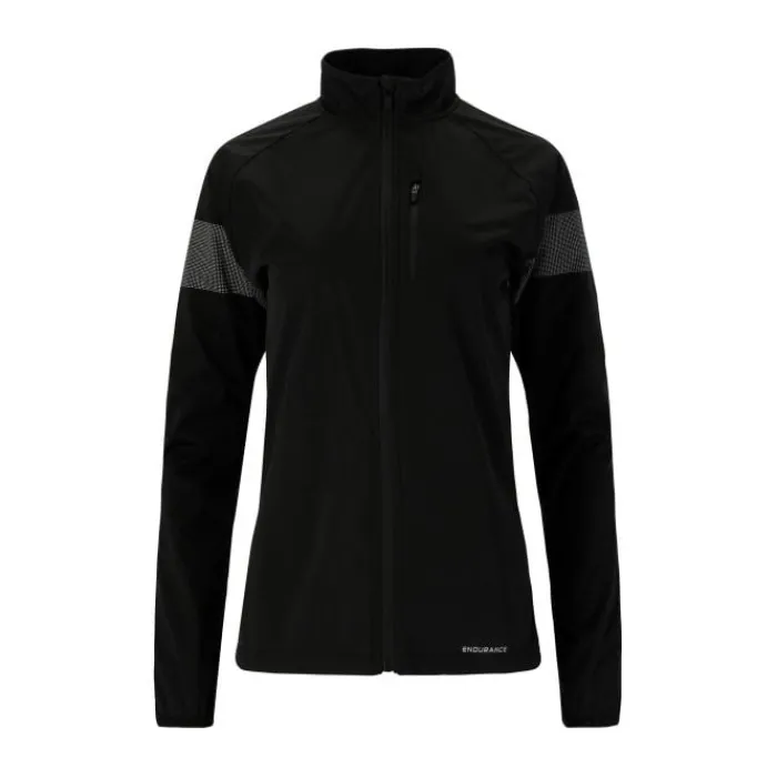 Endurance Belen W Jacket. Elevate your running experience with enhanced safety and comfort. This jacket features reflective details, a chest zipper, and windproof materials to keep you warm and visible.