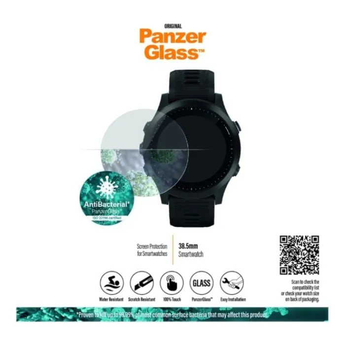 PanzerGlass for on valmistettu alkuperäisestä PanzerGlass-teknologiasta, ja se on valmistettu litteästä karkaistusta lasista, joka peittää kellon koko näytön.