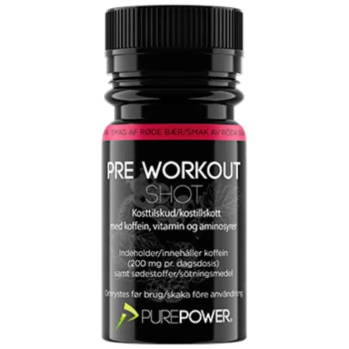 PurePower Pre-Workout Shot on energiajuoma, jota voit käyttää ennen tärkeitä harjoituksia tai kilpailuja. Shot on pakattu kofeiinia, beta-alaniinia, L-arginiinia, ginsengiä ja B6-vitamiinia, kaikki ainesosat, jotka piristävät sinua ja varmistavat, että sinulla on hyvät edellytykset suorittaa parhaasi.