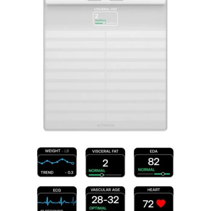 Saa terveystarkastus 90 sekunnissa Withings Body Scan -innovatiivisella terveysasemalla. Tama teknologia tarjoaa yksityiskohtaisen kehoanalyysin ja sydamen terveystiedot jokaisella punnituksella, mukaan lukien EKG ja verisuonien ika. Ominaisuuksia ovat paivittaisen hyvinvoinnin EDA-pisteet, 12 kuukauden akunkesto, monen kayttajan seuranta seka värillinen näyttö, joka helpottaa terveyden seurantaa. Tiedot synkronoidaan helposti Wi-Fi:n tai Bluetoothin kautta sovellukseemme, jossa voit seurata edistymistasi.